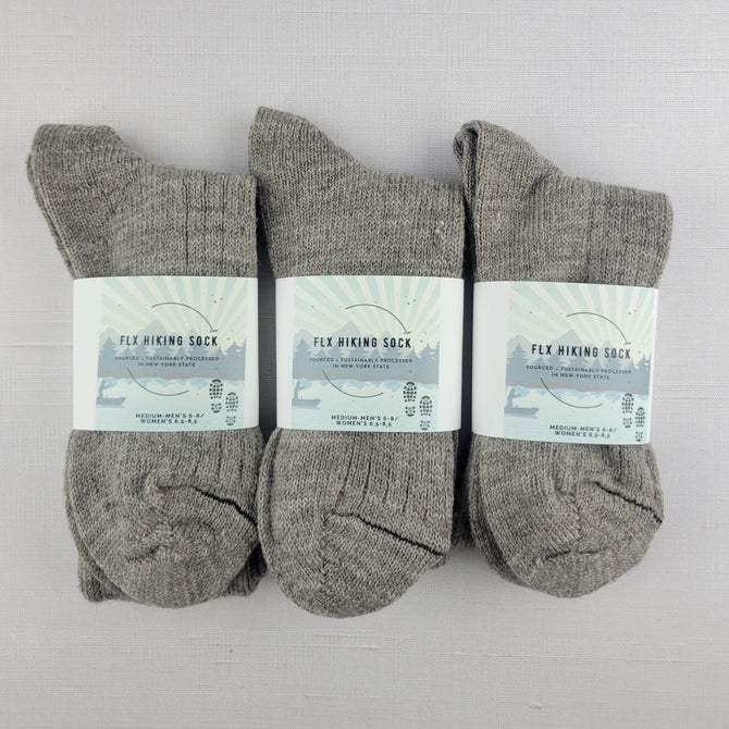 Our NEW hiking socks are the squishy product of over a year's long collaboration with farmers, a fiber mill, and a commercial sock knitter! Did we mention they are expertly crafted from New York State wool? The yarn is sourced in the Finger Lakes region, hence the local moniker: FLX.