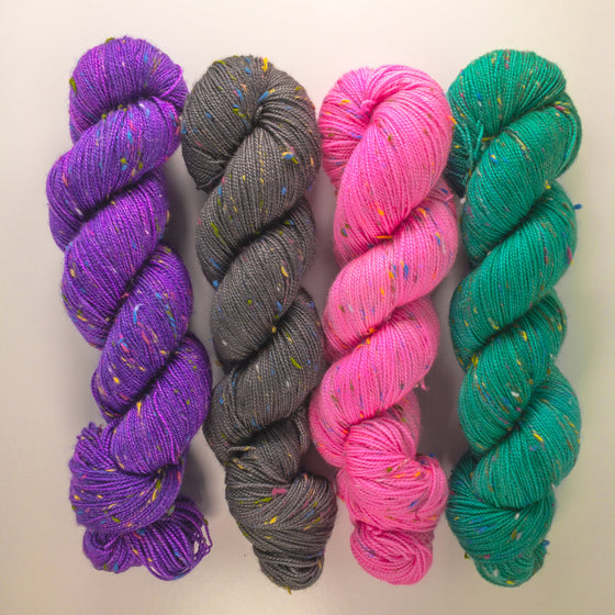 Side Hustle Fiber Co. is a one of our awesome local dyers! You can always expect luxurious yarn with vibrant fun colors in a range of semi-solids, speckles, and more! With Twist and Tweed, Ryann has brought her eye-catching style to a rainbow tweed base and we can't even decide which color is our favorite!